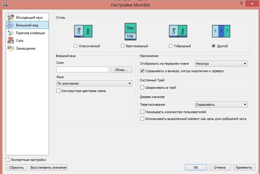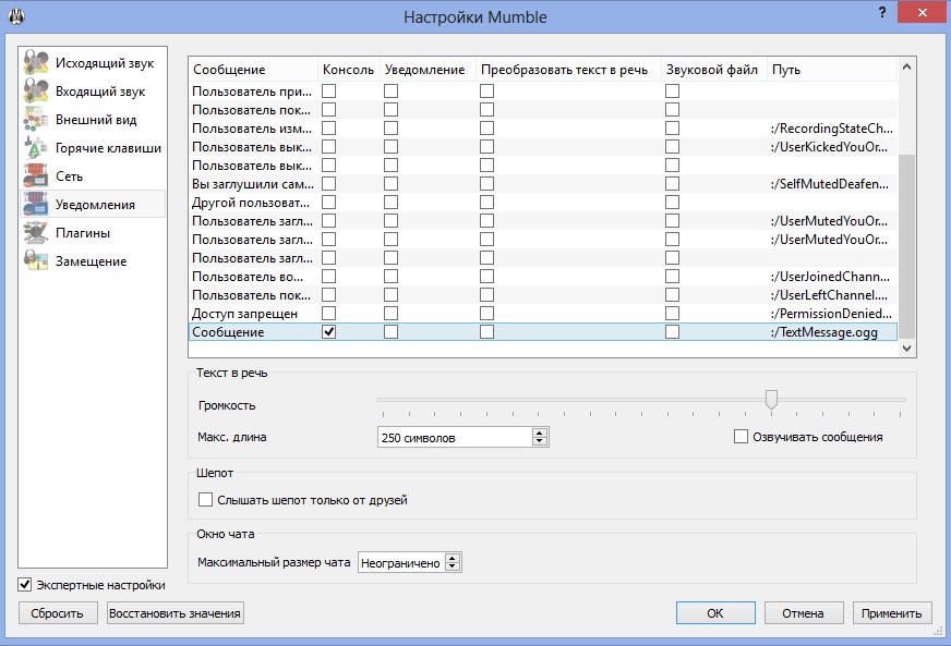 Еще рекомендую в меню "настройка(галочка - экспертные) - оповещения", снять все галочки кроме "сообщения-консоль", чтобы системными сообщениями не забивался чат, и голос робота не докладывал каждый раз когда кто-то входит и выходит с канала. Без галочки "сообщения" вы не увидите чата мамбл.