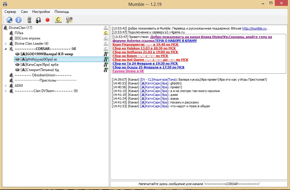 | Вступление. Что такое Мамбл и зачем нам туда переходить из РК? Причин несколько - во первых там наши новые союзники, а связь с ними означает больше совместных действий (в РК практически кроме нашего клана нет никого), которые продвинут клан в развитии. В частности меня интересует кооперация на форты. Но мы будем стараться помогать им на всех мероприятиях. Для тех кто не любит пвп, у них так же собираются на кач и инсты, то есть шанс найти пати намного выше, чем в одном нашем клане. У обоих клиентов что РК что Мамбл, есть свои плюсы и минусы, однозначно сказать какой из них лучше, нельзя. РК проще, более распостранен, приятней на вид. У Мамбл больше настроек, позволяющих настроить клиент под себя, хорошо развит оверлей - мини панелька говорилки прямо в игре, не нужно переключать окна чтобы видеть кто говорит, а те кто пишут могут озвучить свой текст. Еще Мамбл не тербует регистрации аккаунта, он создается автоматически.