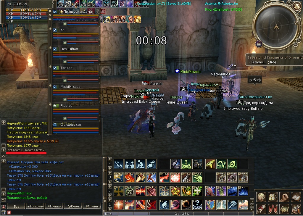 В самом рифте 8 различных комнат, меняющихся в случайном порядке, и одна комната с рб, на котором можно качать СА до 13. На каждую комнату дается 10 минут. За один заход можно побывать лишь в 4х комнатах. Рб бить не обязательно, если его не трогать пару минут, комната сама закроется. Также в каждой комнате есть шарик-нпс, через него ПЛ пожет один раз сменить комнату, выйти из рифта и дважды "умножить" комнату. Всего 4 вида множки - на силу мобов, скорость их респа, количество и редкая множка на чампов. Выберите "я готово к большему испытанию" чтобы случайно умножить комнату. Если пати слабовата, лучше умножать не сразу а постепенно - раз убили комнату без множки, на второй раз умножили, если живы - еще раз умножили.
